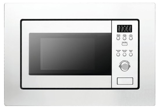 встраиваемая микроволновая печь, 3 режима приготовления (микроволны, гриль, гриль+микроволны), электронная панель управления, белый дисплей, мощность тэнового гриля 1000 Вт , цвет: нержавеющая сталь (с защитным покрытием от следов пальцев), объем 20 литров, 5 уровней мощности микроволн (800 Вт), 8 программ автоприготовления, цифровой таймер до 95 мин., кнопка +30 сек., автоматическая разморозка по времени и весу, внутреннее покрытие из нержавеющей стали, принудительная вентиляция, функция блокировки для защиты от детей, поворотный столик Ø 245 мм, круглая решетка, рамка для встраивания