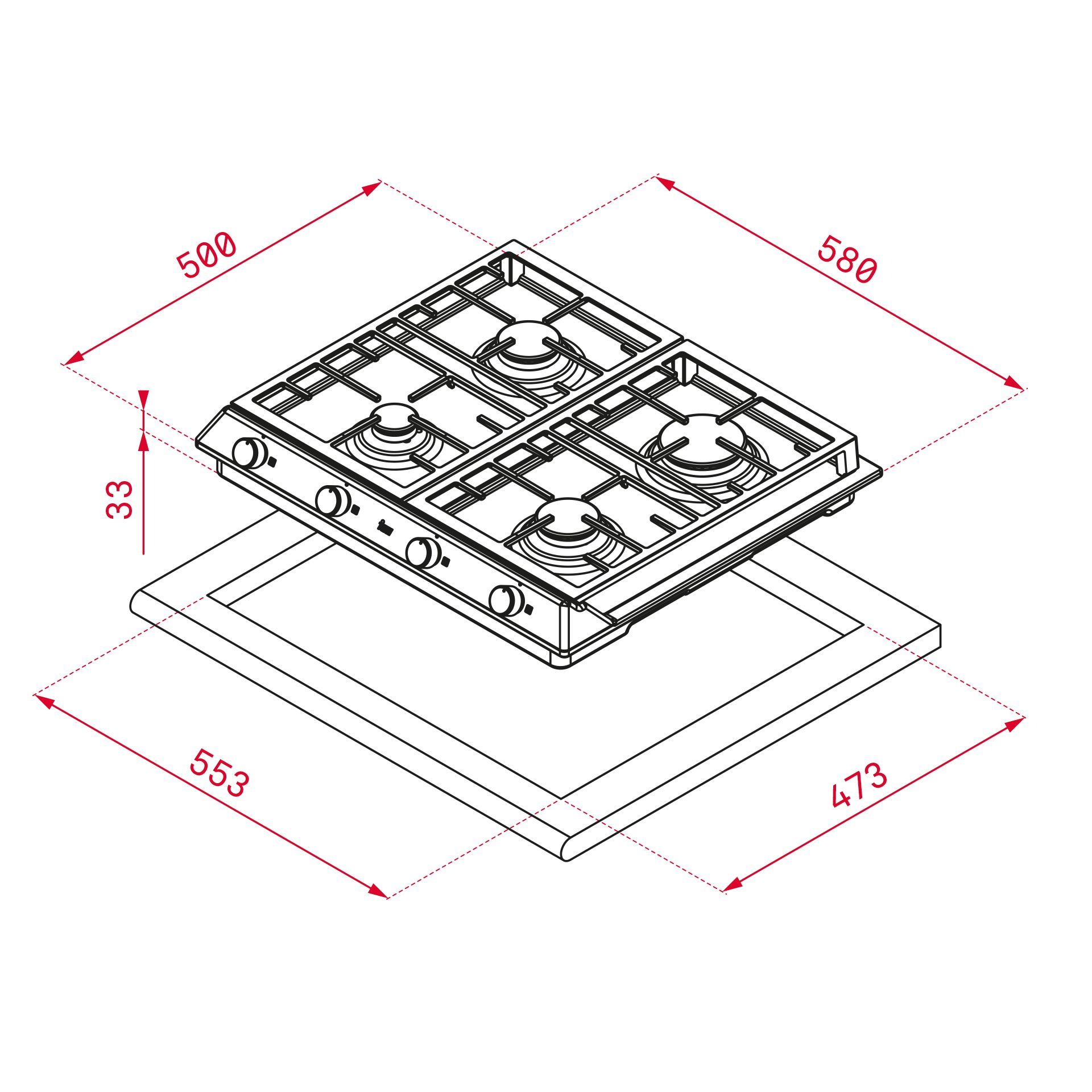 газовая варочная панель, сверкающие чёрные фронтальные регуляторы с ободком под металл, профессиональные чугунные решётки образуют единую поверхность для скольжения посуды, нержавеющая сталь, автоподжиг на каждой  горелке, газ-контоль на каждой горелке, 4 зоны приготовления с высокоэффективными горелками (69%): 1 основная горелка (2,8 кВт), 2 средних горелки (1,75 кВт), 1 дополнительная горелка (1,0 кВт), тип газа: LPG (бутан, пропан,), природный, размеры в мм: 580х500х52